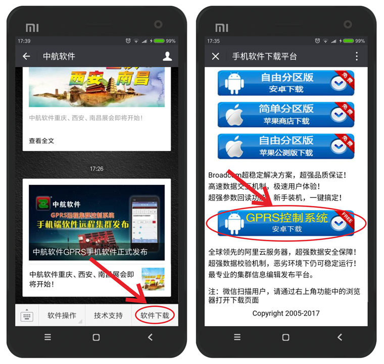第1種方法:進入中航軟件微信公眾平臺,點擊右下角“軟件下載”--點擊“GPRS控制系統(tǒng)安卓下載”按鈕。使用瀏覽器打開,點擊下載,安裝完畢即可使用。