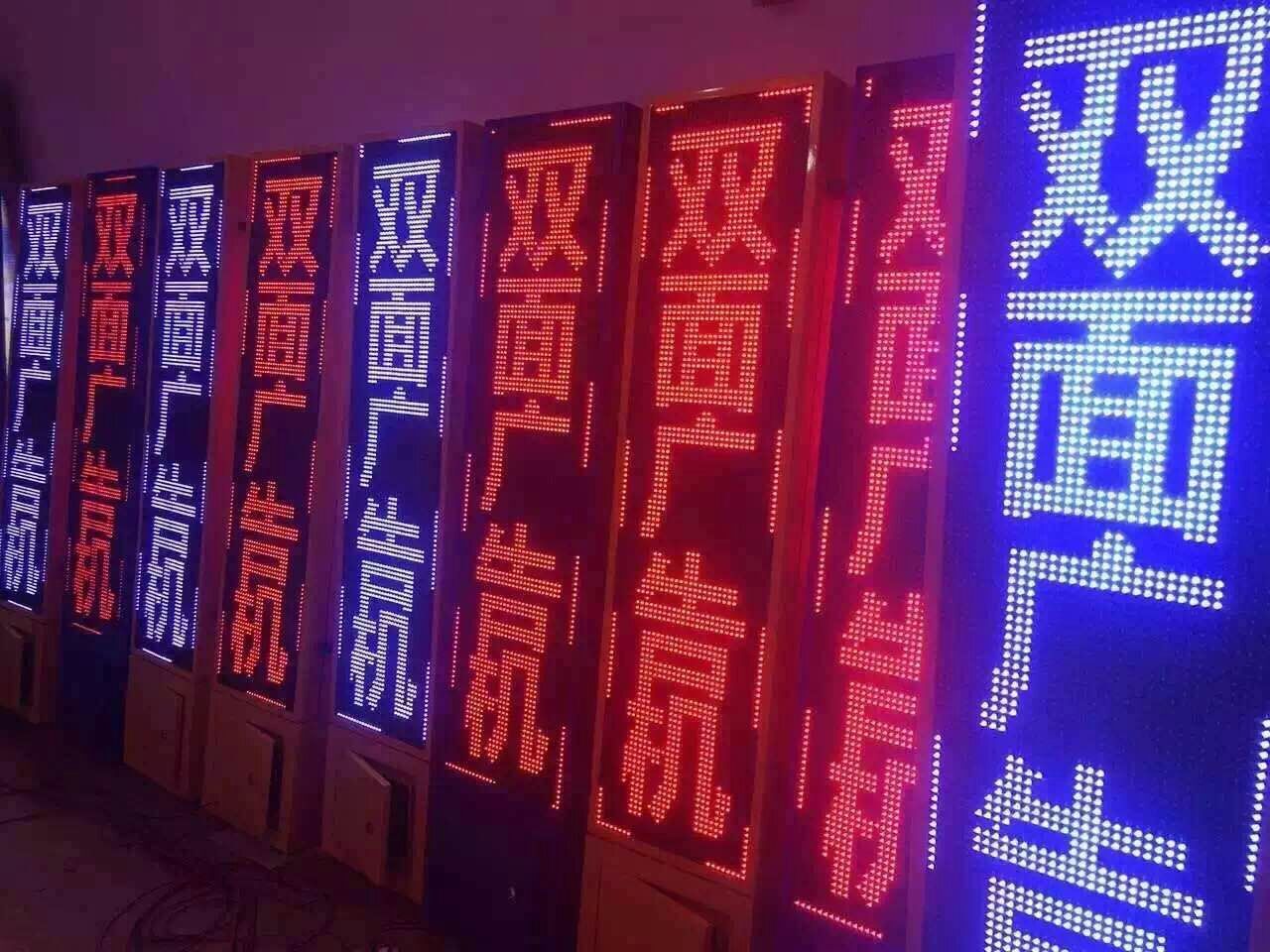 一般市面上采用P10單元板,外框材質(zhì)多采用冷軋板高溫烤漆,發(fā)光顏色可定制紅綠黃白藍(lán)紫等,前后雙面獨(dú)立顯示廣告。優(yōu)點(diǎn):攜帶、移動方便,手機(jī)操作極其方便。可廣泛用于小商品城、電子城、擺攤、臨街商鋪等廣告促銷。