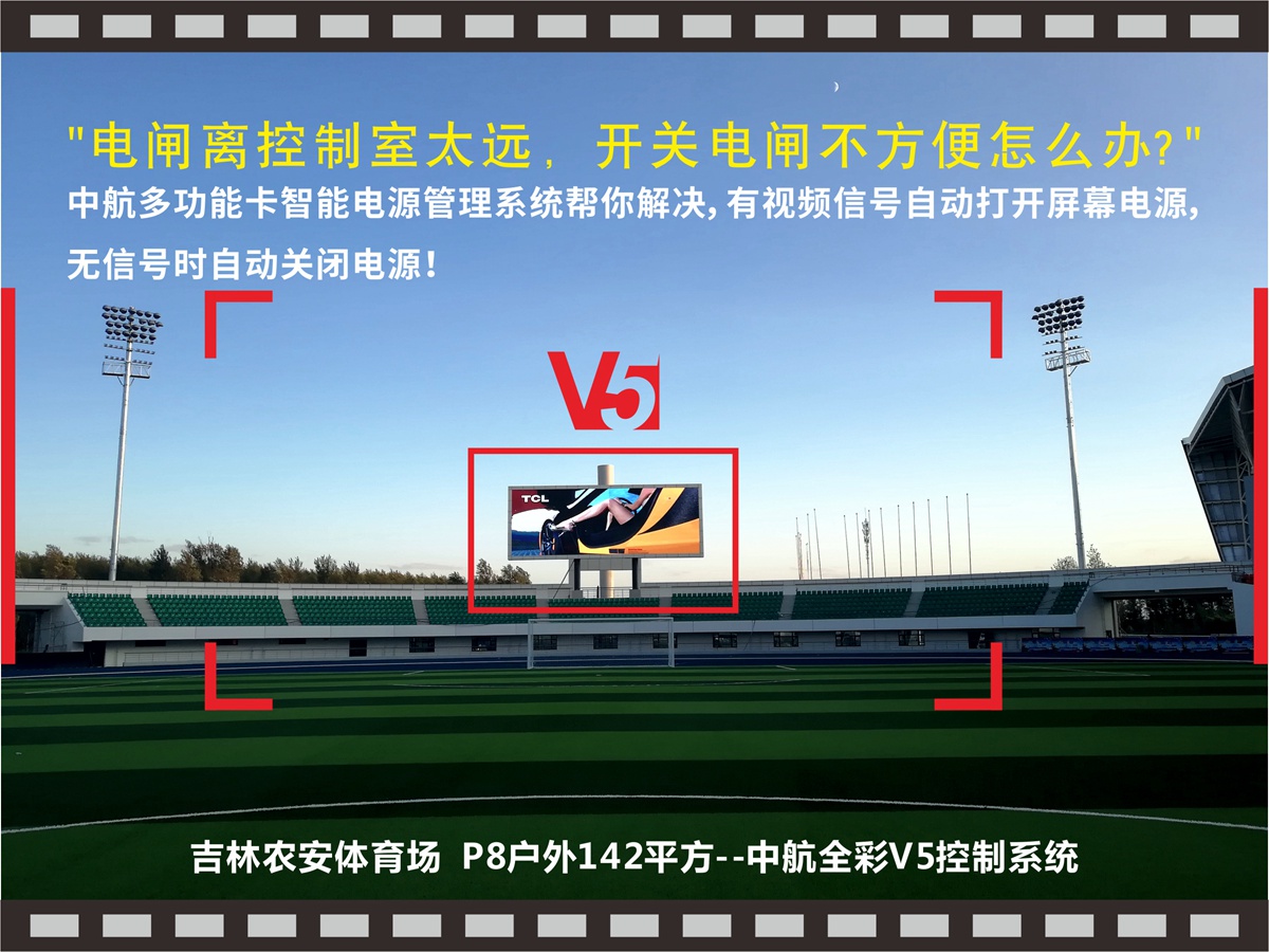 【中航V5精品案例選集】:“電閘離控制室太遠(yuǎn),開關(guān)電閘不方便怎么辦”?中航多功能卡智能電源管理系統(tǒng)幫你解決,有視頻信號(hào)自動(dòng)打開屏幕電源,無信號(hào)時(shí)自動(dòng)關(guān)閉電源!吉林農(nóng)安體育場(chǎng),P8戶外142平方,中航全彩系統(tǒng)完美點(diǎn)亮。感謝長(zhǎng)春科美李總對(duì)中航的大力支持,我們會(huì)努力做的更好!