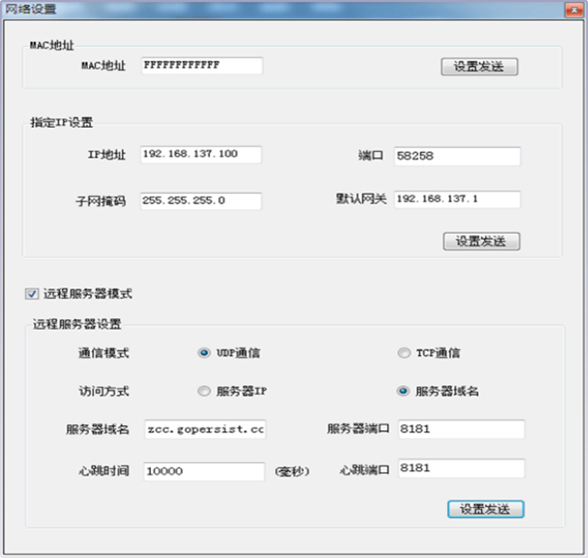 遠程服務(wù)器設(shè)置:可以選擇IP或者域名;公司搭建的云服務(wù)器一律設(shè)置域名,且服務(wù)器端口、心跳時間也不可改變;用戶搭建的服務(wù)器建議使用IP,端口可改變。